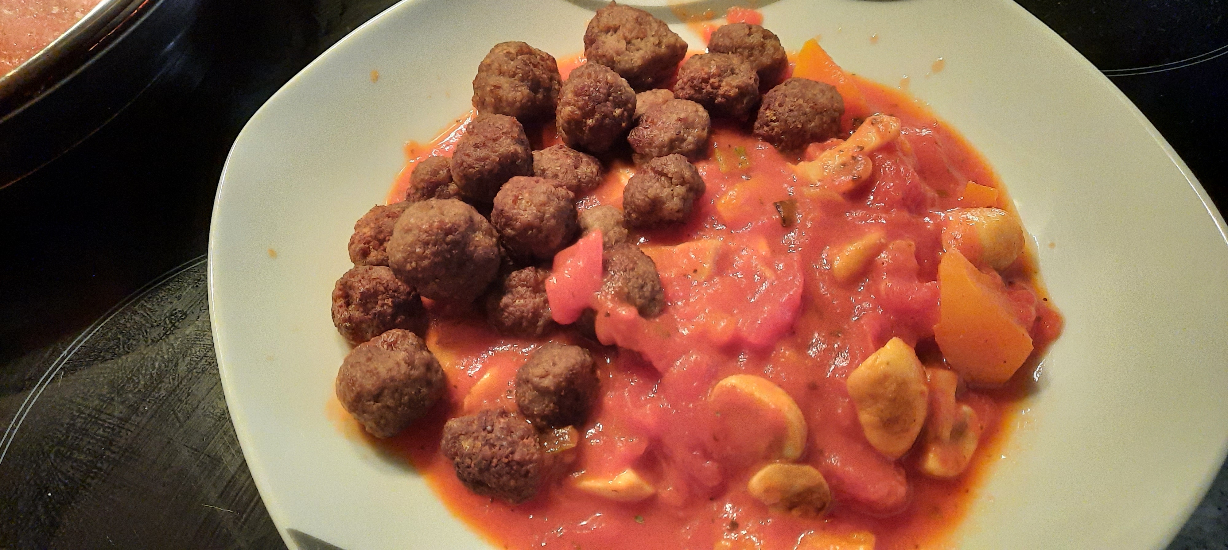 und zum Abendessen gab es Fleischklößchen in Tomatensauce….hahaha. Seit der Serie „Bing-Bang-Theory“ weiß ich, das man das tatsächlich mit Spaghetti essen kann…ich mag es aber trotzdem lieber mit Reis….