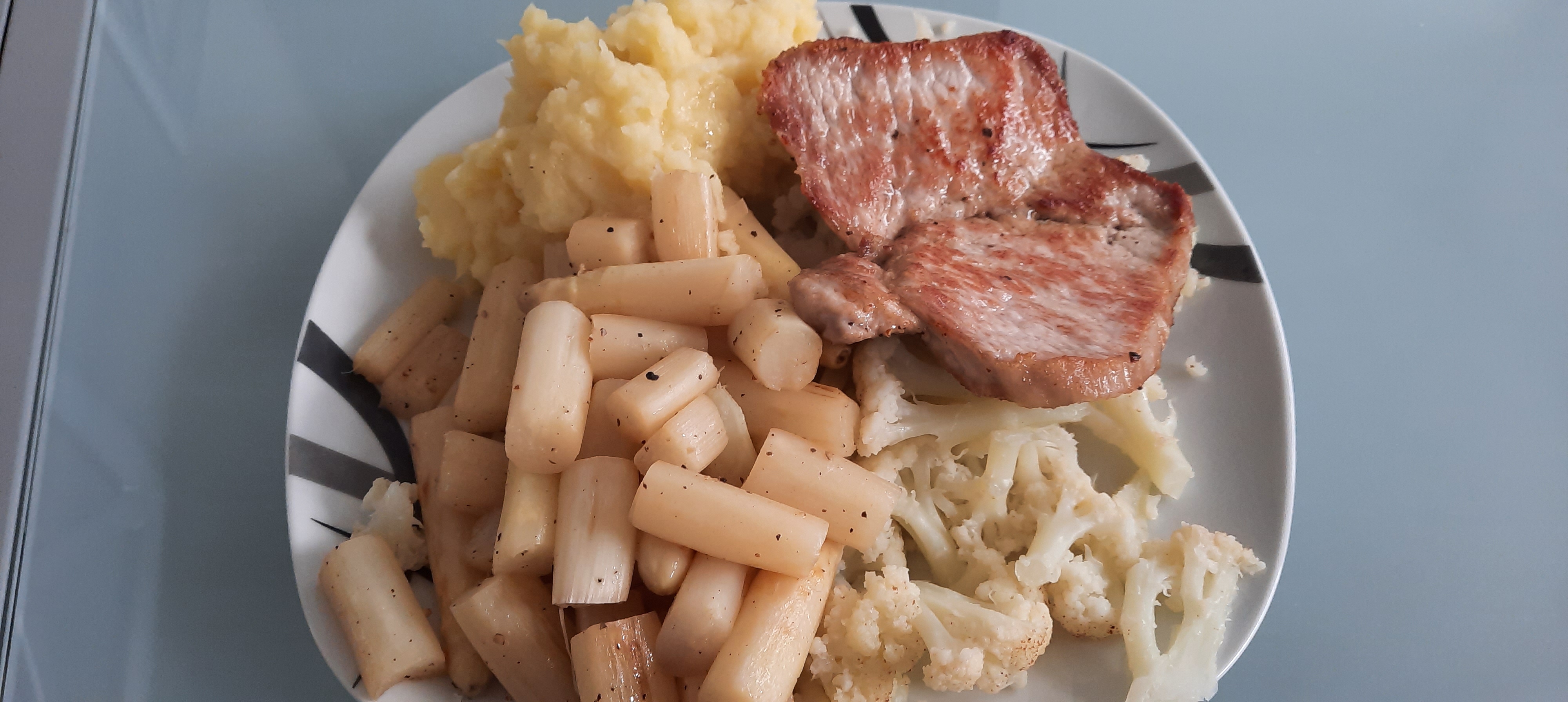 Mit Kochen hatte ich es in dieser Woche nicht wirklich….gut Pfingstmontag hab ich noch einmal Kartoffelpüree mit gebratenem Spargel und einem Schmetterlingssteak vom Iberico-Schein gemacht.