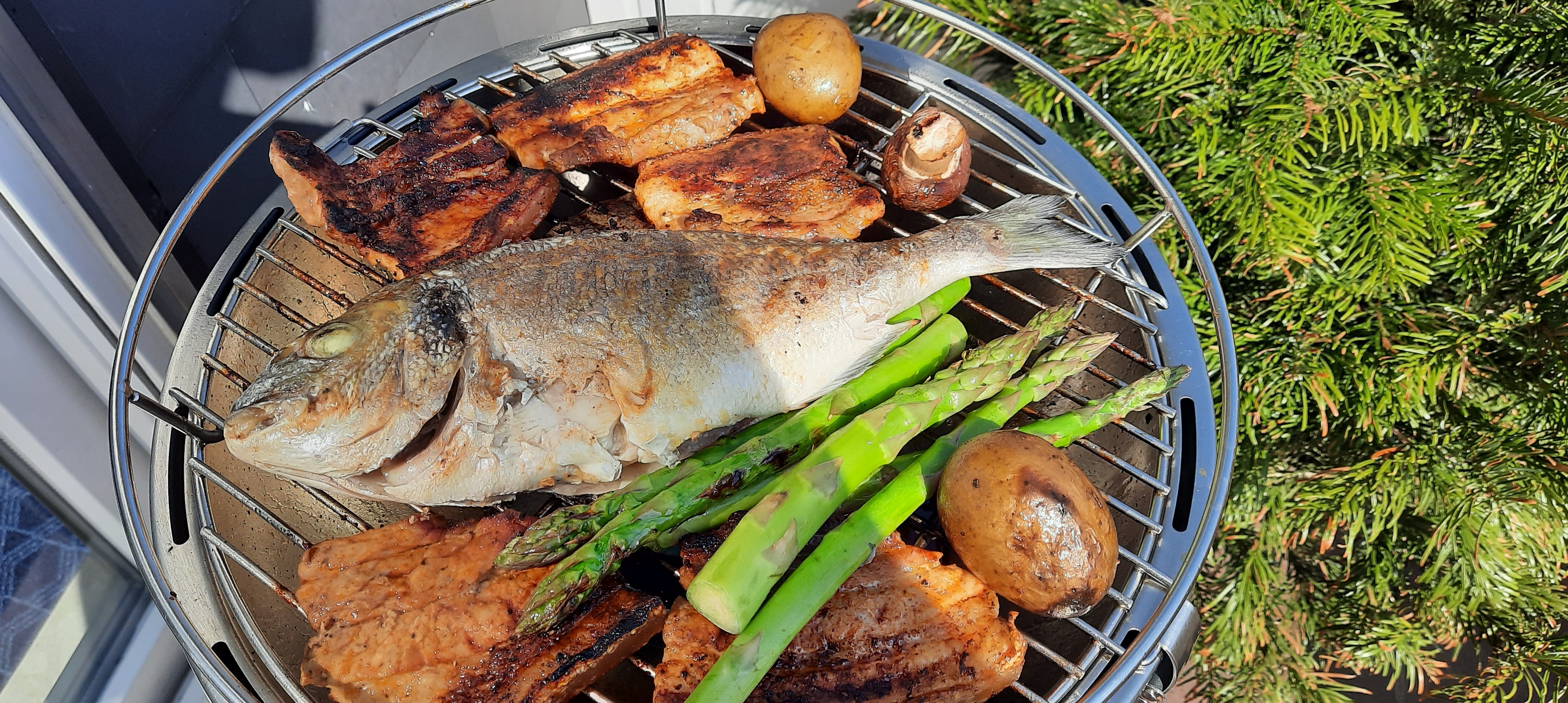 Das war schön gemütlich…ich hatte mein Sonnendach aufgespannt und saß gemütlich im Schatten…..der Duft des Bauchfleisches und der Dorade waren einfach klasse… und der Geschmack erst.
