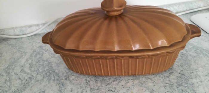 Ich hab nach einem alten Bräter oder Topf Ausschau gehalten, um meine Brote gut aufbewahren zu können und bin auf den hier gestoßen: Für 3,50 EUR hab ich ihn mit genommen.