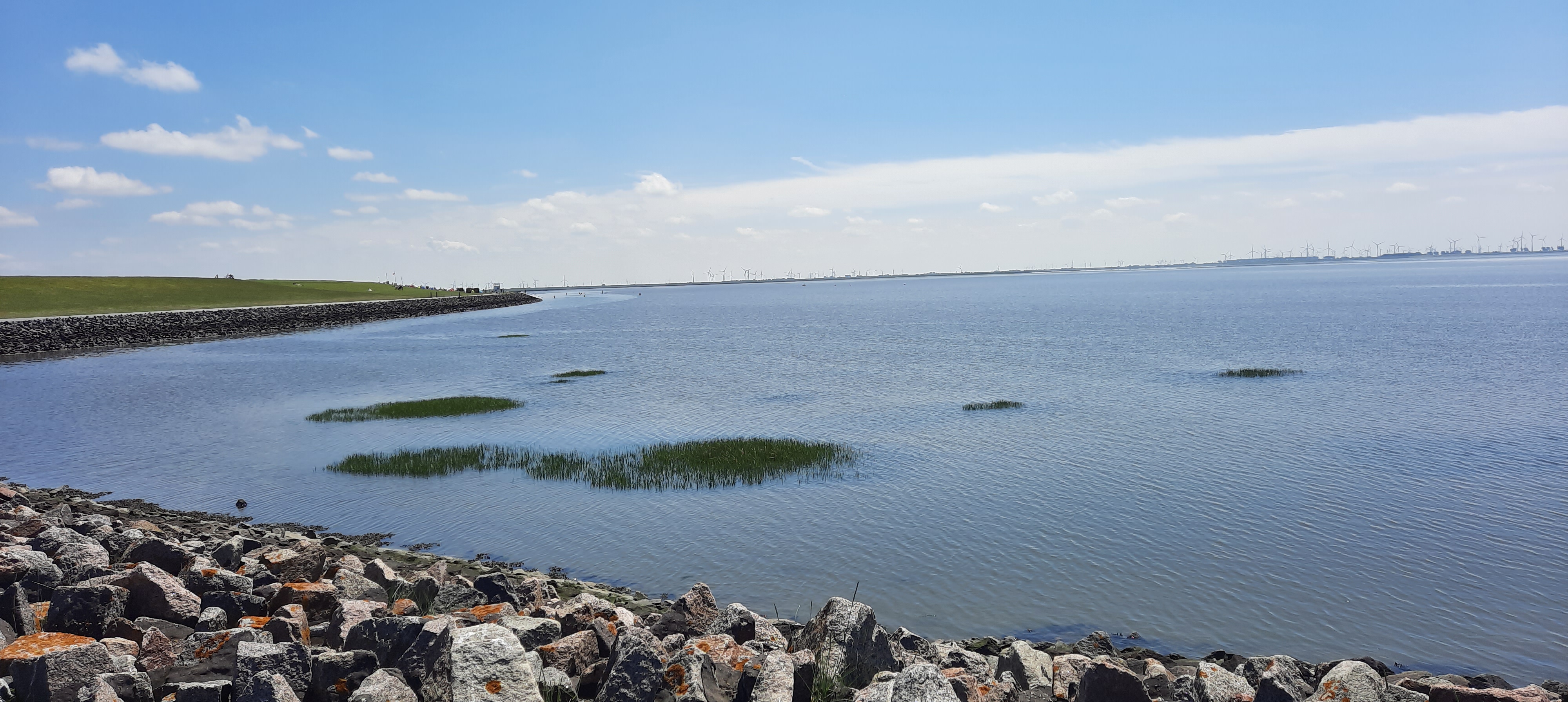 Dann ging es wieder über den Deich und weiter um das Kronenloch herum….Es handelt sich hierbei um ein Naturschutzgebiet mit einem großen Salzsee in der Mitte. Wie der NABU schreibt, gibt es ein „absolutes Betretungsverbot“, weil hier die Salzwiesen-Pflanzen nahezu ohne menschliches Eingreifen wachsen sollen.
