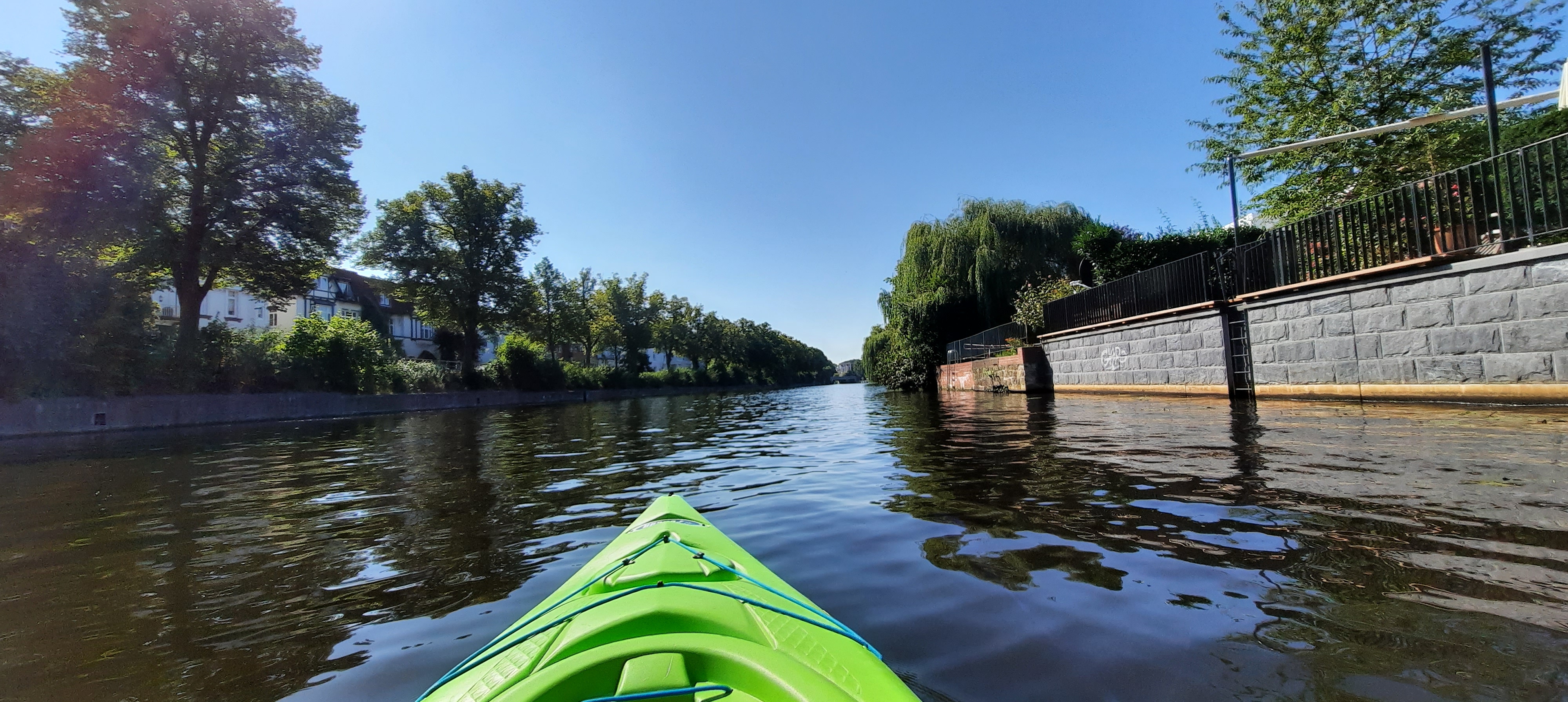 Die wirken gemütlicher und durch die Trauerweiden auch etwas schattiger. Außerdem waren dort eindeutig gemütlichere Paddler unterwegs…..ich hab tief eingeatmet und alles um mich herum genossen…..was für eine Aussicht….was für tolle Häuser sich hier aneinander reihen….was für schöne Gärten und kleine Bootsanleger…..wie friedlich alles in der Sonne lag…..ganze Familien waren in den Booten unterwegs…die Kleinen mit Schwimmweste…die SUP-Paddler in gelassener gerader Haltung…Jugendliche die sich entspannt in Schlauchbooten sonnten….Ein paar Angler an den Rändern…