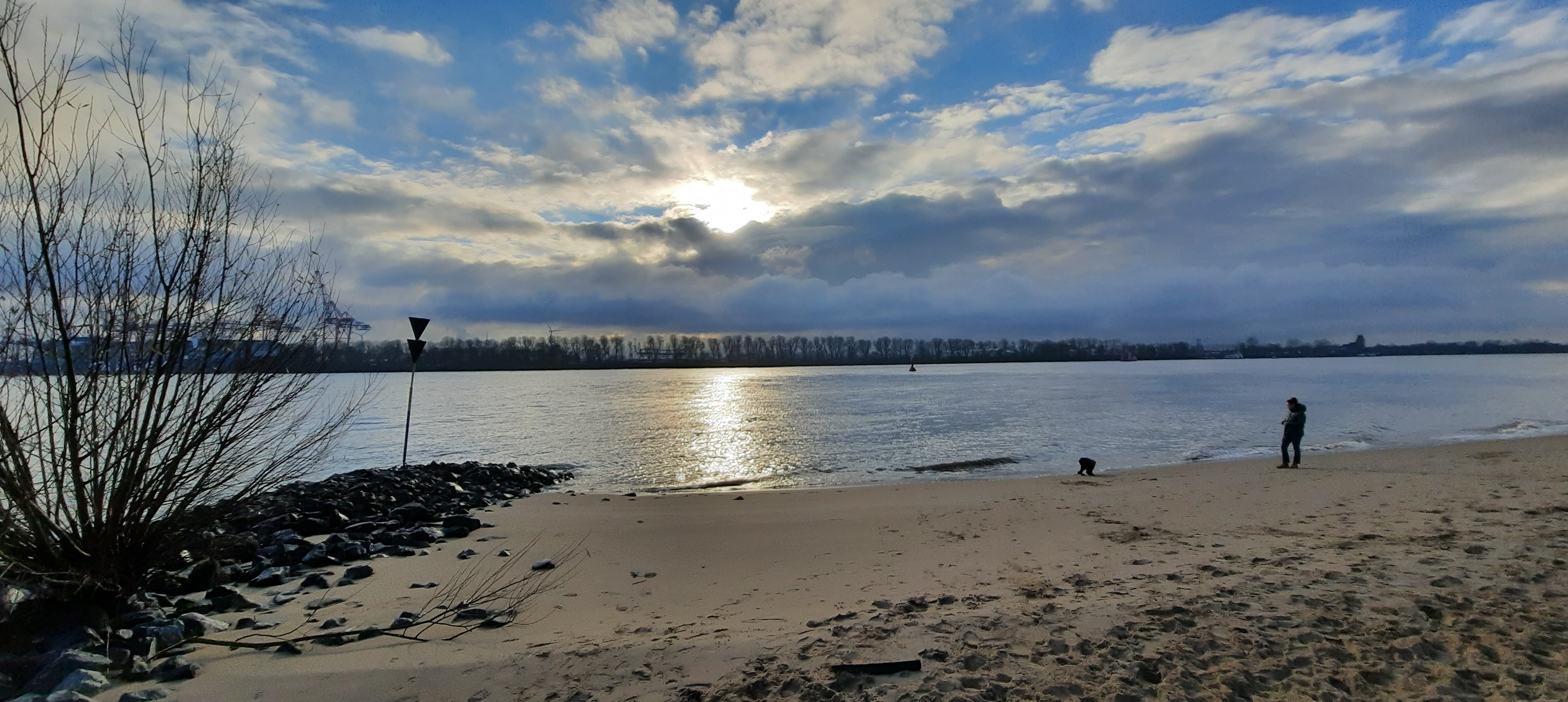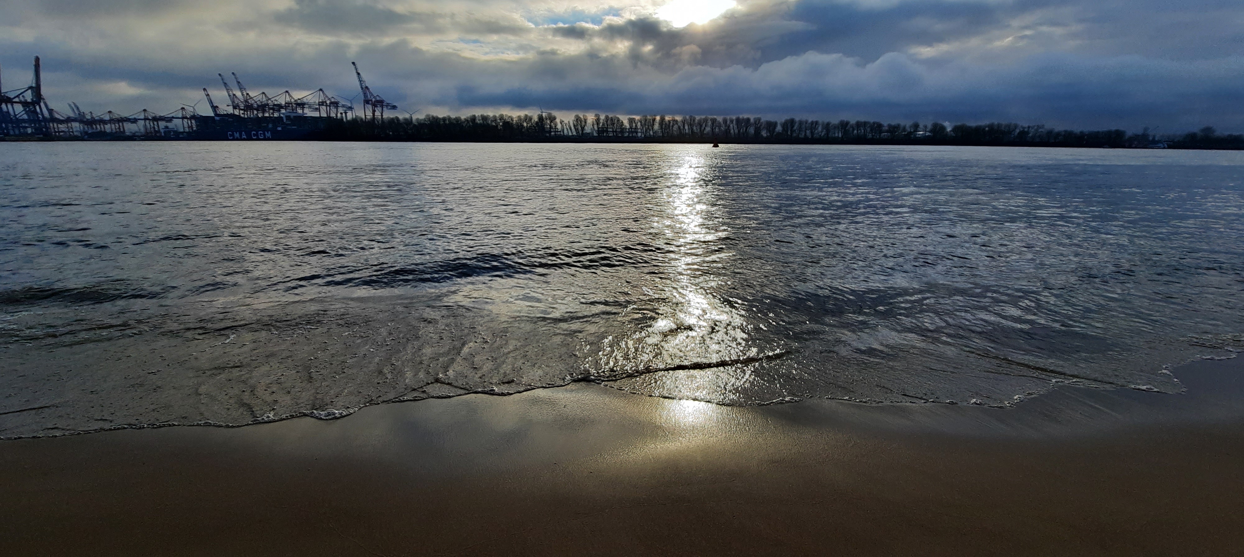 Hamburg ist bei jedem Wetter schön, auch bei bewölkten 3 Grad an einem Montagmittag Ende November…Ich hatte aber auch richtig Glück. Minuten nachdem ich am Elbstrand bei Övelgönne ans Wasser ging, riss die Wolkendeck immer mehr auf und die Sonne kam raus…