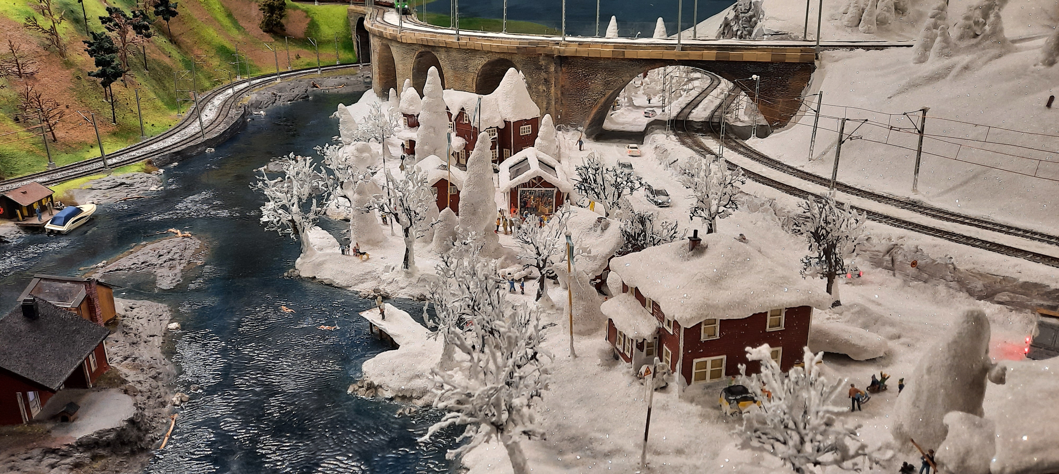 Es gilt als die größte Modelleisenbahnanlage der Welt (lt.Wikipedia) aber inzwischen hat sich der Fokus verschoben, weg von der Eisenbahnanlage mit interessanter Umgebung, hin zu den landschaftlichen und städtischen Attraktionen verschiedener Länder und Gebiete….und den vielen vielen Tausenden kleiner menschlichen Szenen die dort mit viel Liebe zum Details und mit einer gehörigen Portion Witz dargestellt werden (Findet Ihr die 2 sehr besonderen Gestalten + Hund im Bild unten? Hihihi)