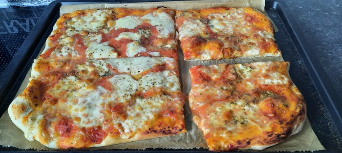 Mein Teig jedenfalls ließ sich super kneten, war nicht klebrig, dafür schön elastisch…also hab ich mich entschieden aus einem Teil eine Pizza zu backen: