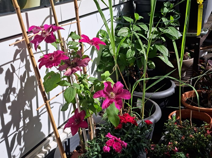 Nur so kann ich die überhaupt etwas auf meinem Laptop-Display etwas erkennen. Ich habe einen Westbalkon, da kommt die Sonne erst am Nachmittag um das Haus herum und überflutet den Balkon nach und nach….die Clematis fühlt sich zumindest noch sehr wohl…obwohl sie erst ab ca.16.30 so richtig voll in er Sonne steht. Sie hat prachtvolle Blüten entwickelt und ist auch schon ein gutes Stück gewachsen: