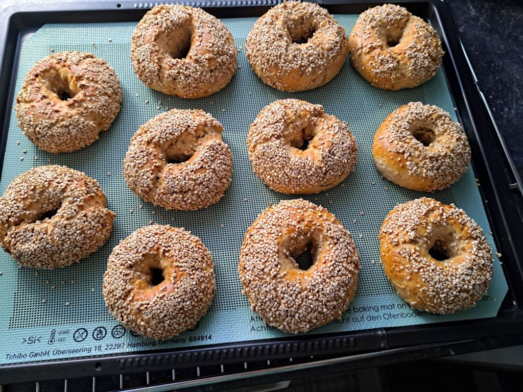 Ich hab alle Zutaten zusammen gemischt, Bagel daraus geformt, jeden Teigling für 20 Sekunden in heißem Wasser gesiedet, in Sesamkörnern gewälzt und dann für 30 Minuten im Backofen gebacken…und natürlich hab ich die ersten Beiden noch heiß mit Butter und etwas Käse belegt, gleich gegessen…hmm erstaunlich luftig und lecker: