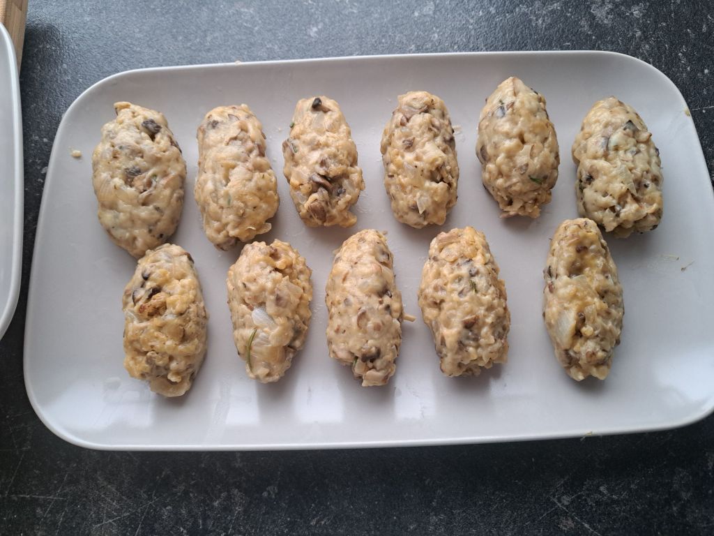 Die Pfanne zur Seite stellen und die Pilzmasse abkühlen lassen. Das dauert eine kleine Weile. Die fast kalte Masse nun mit leicht angefeuchteten Händen zu kleinen Kroketten von ca.5 cm Länge rollen. Bei mir sind es 17 Stück geworden. Anschließend ganz klassisch mit Mehl, Ei und Paniermehl panieren.