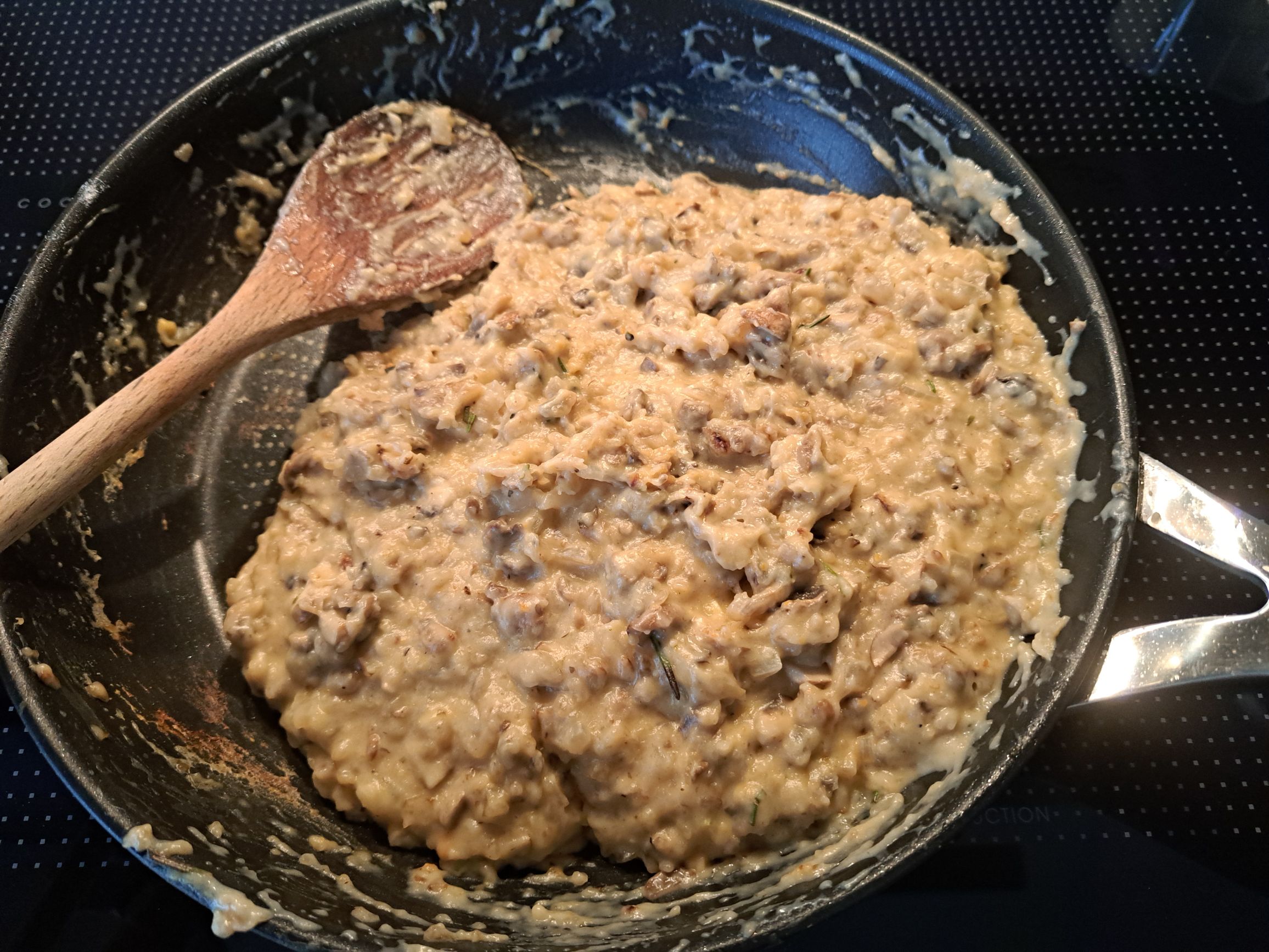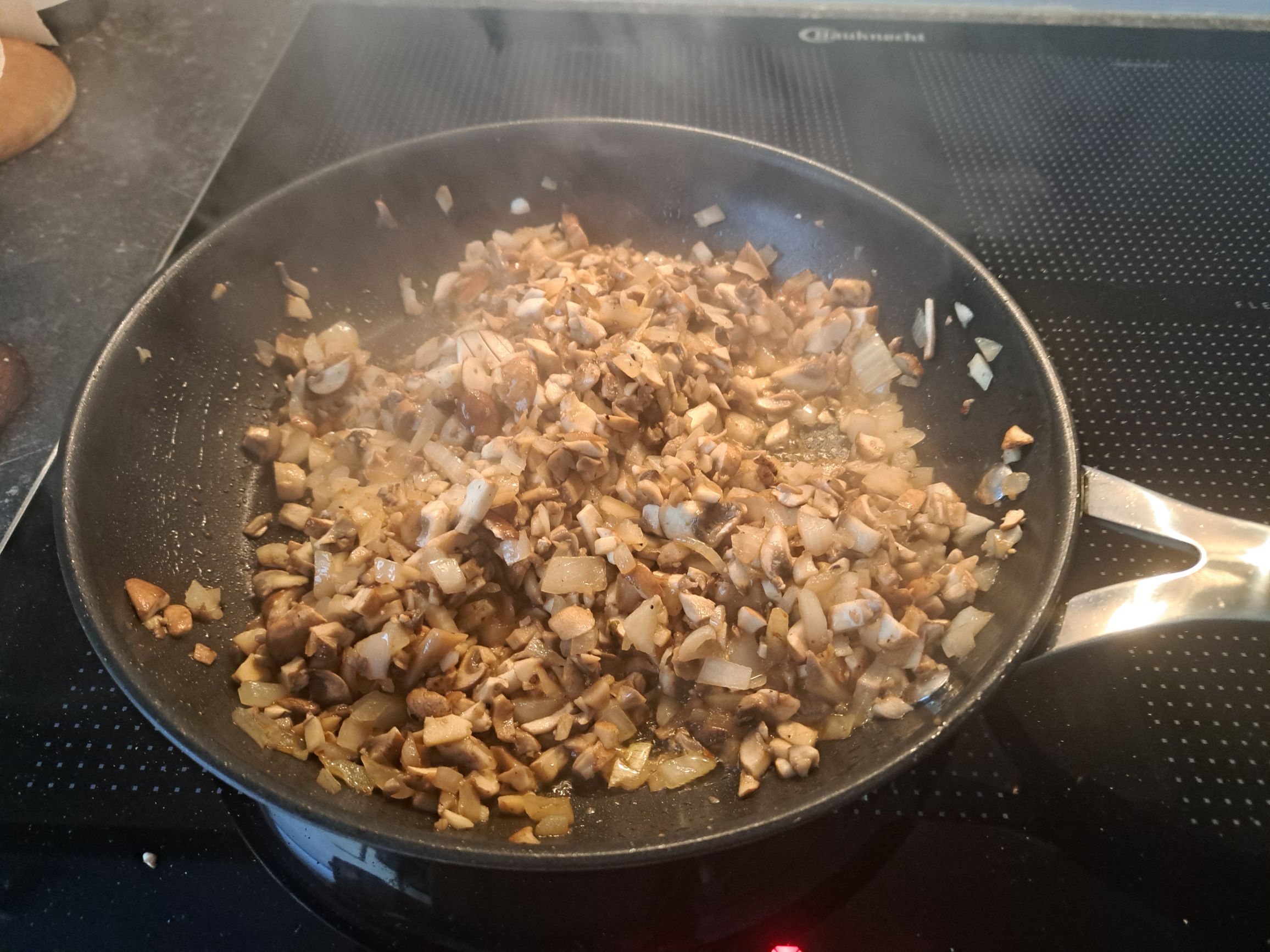 Hier nun die Rezept-Mengen. Ich habe tatsächlich nur wenig verändert: im Original-Rezept standen 150g Champignons, ich habe 200 g genommen…und würde beim nächsten Mal sogar noch etwas mehr nehmen, aber das ist Geschmackssache – ich liebe den Geschmack von gerösteten Champignons, nehme sie oft als „Fleischersatz“, weil Champignons eine Menge Umami-Geschmack enthalten.