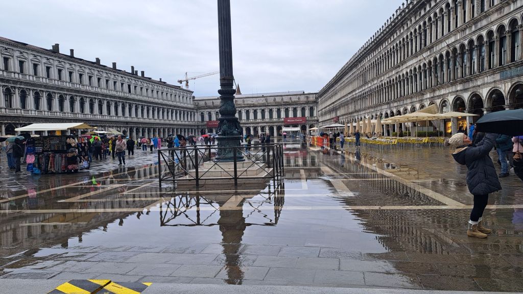 Es hat die Nacht über geregnet und am Morgen konnte man auf dem Markusplatz und drumherum unmittelbar die Auswirkungen sehen und spüren.