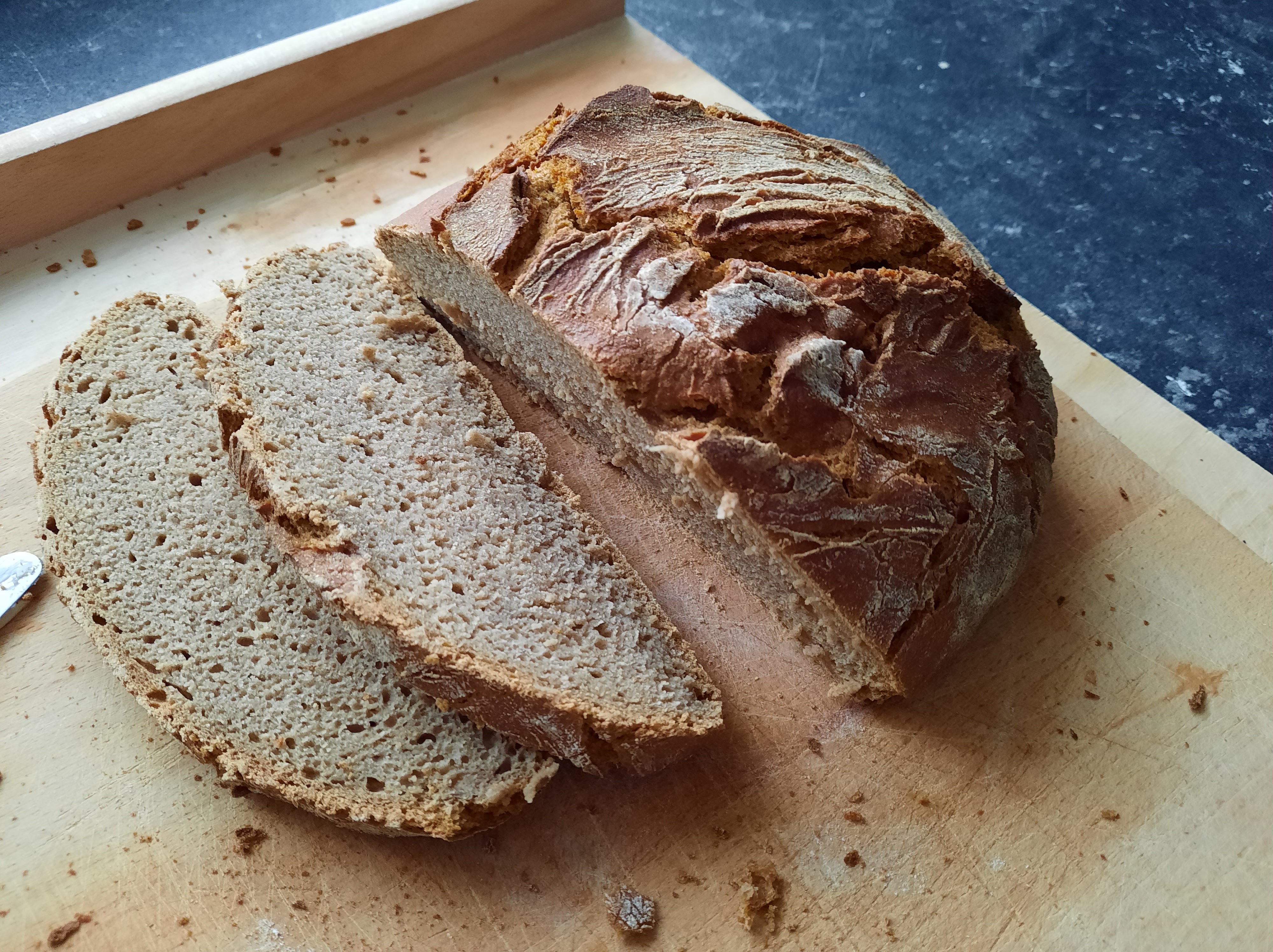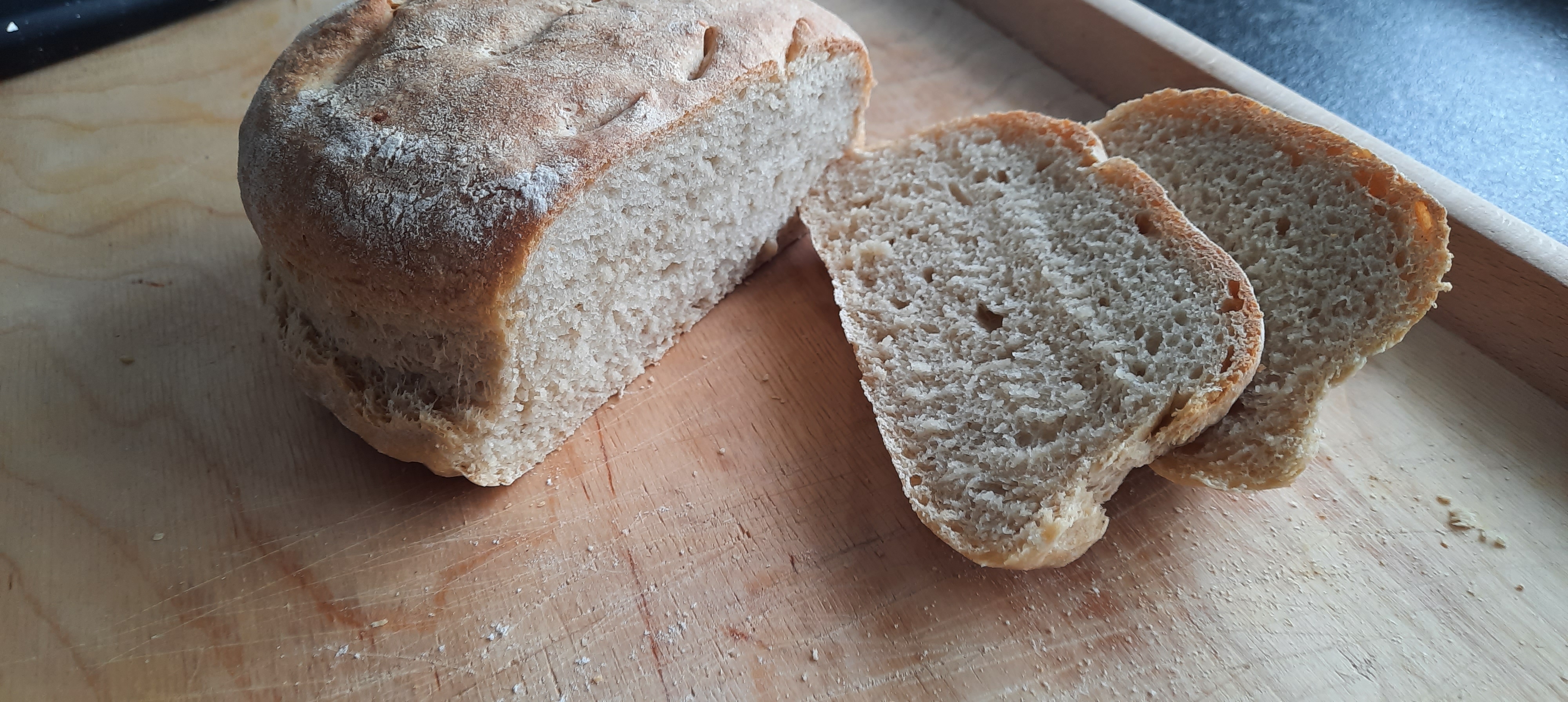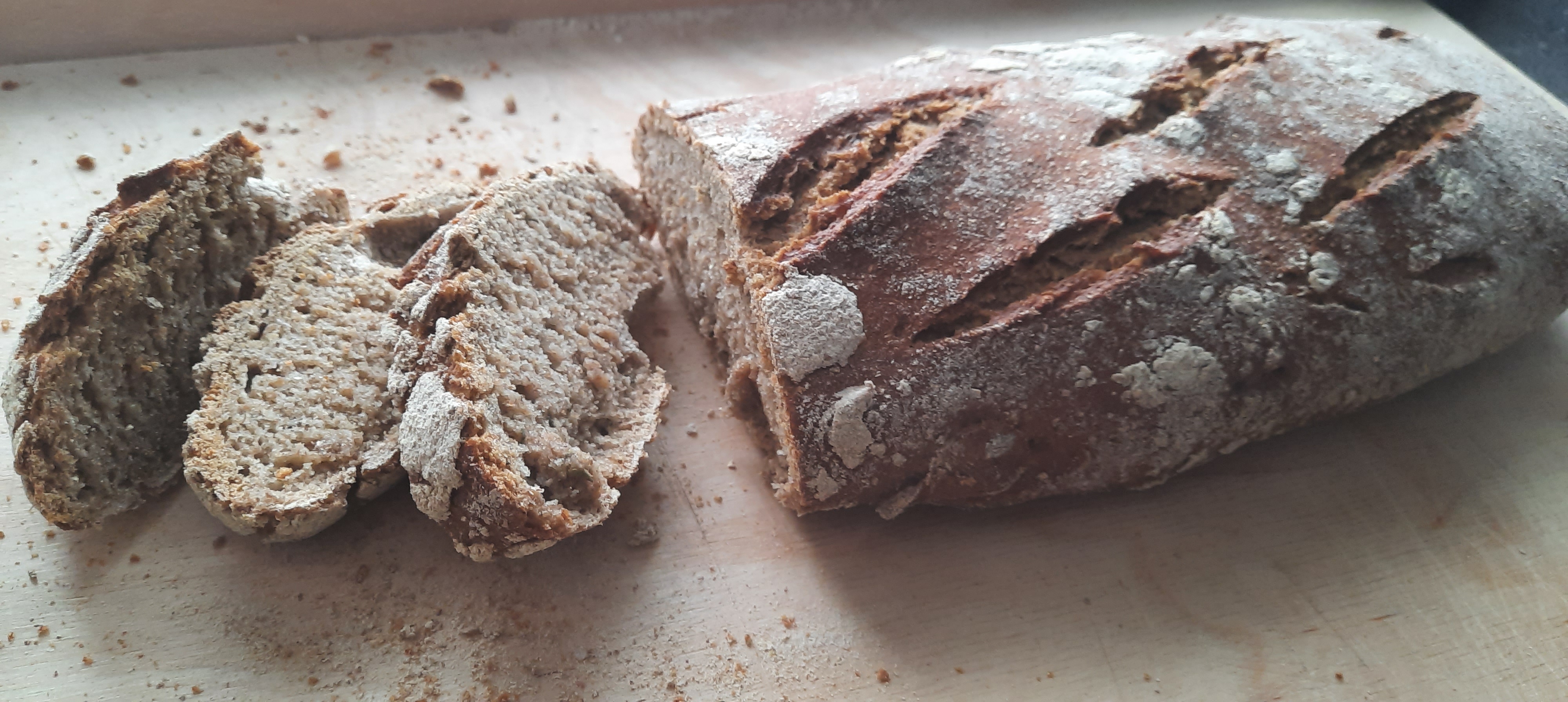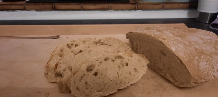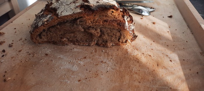 Mein Lernfortschritt heute: ich habe mich gezwungen das noch heiße Brot nicht gleich anzuschneiden, sondern es tatsächlich erst mal eine Weile auf einem Gitterrost auskühlen zu lassen…so lässt es sich tatsächlich viel besser schneiden.