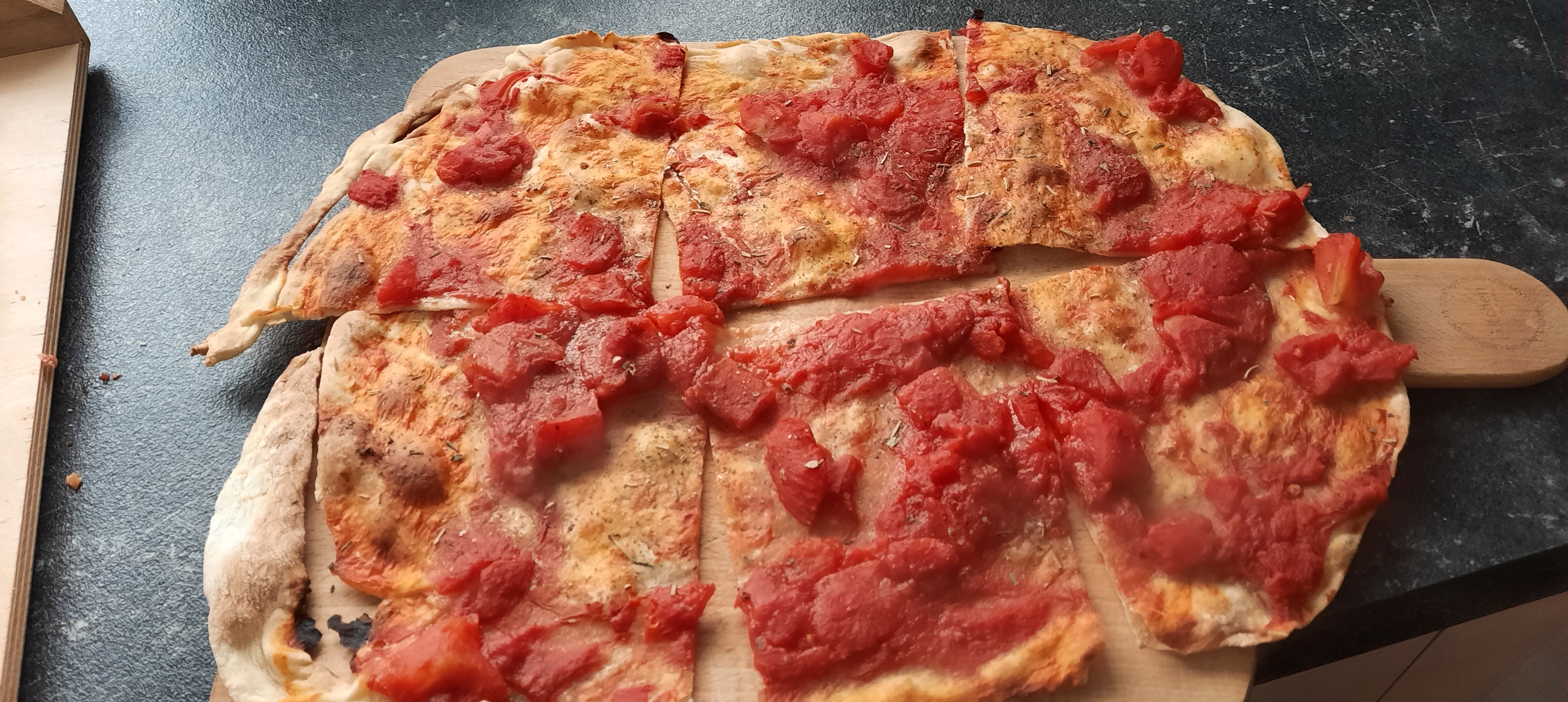 Backkzeit: 50 Minuten bei Ober-/Unterhitze mit 220 Grad für 10 Minuten mit Wasserdampf durch eine Schale Wasser am Boden des Backofens und den Rest der Zeit bei 200 Grad ohne Dampf.
