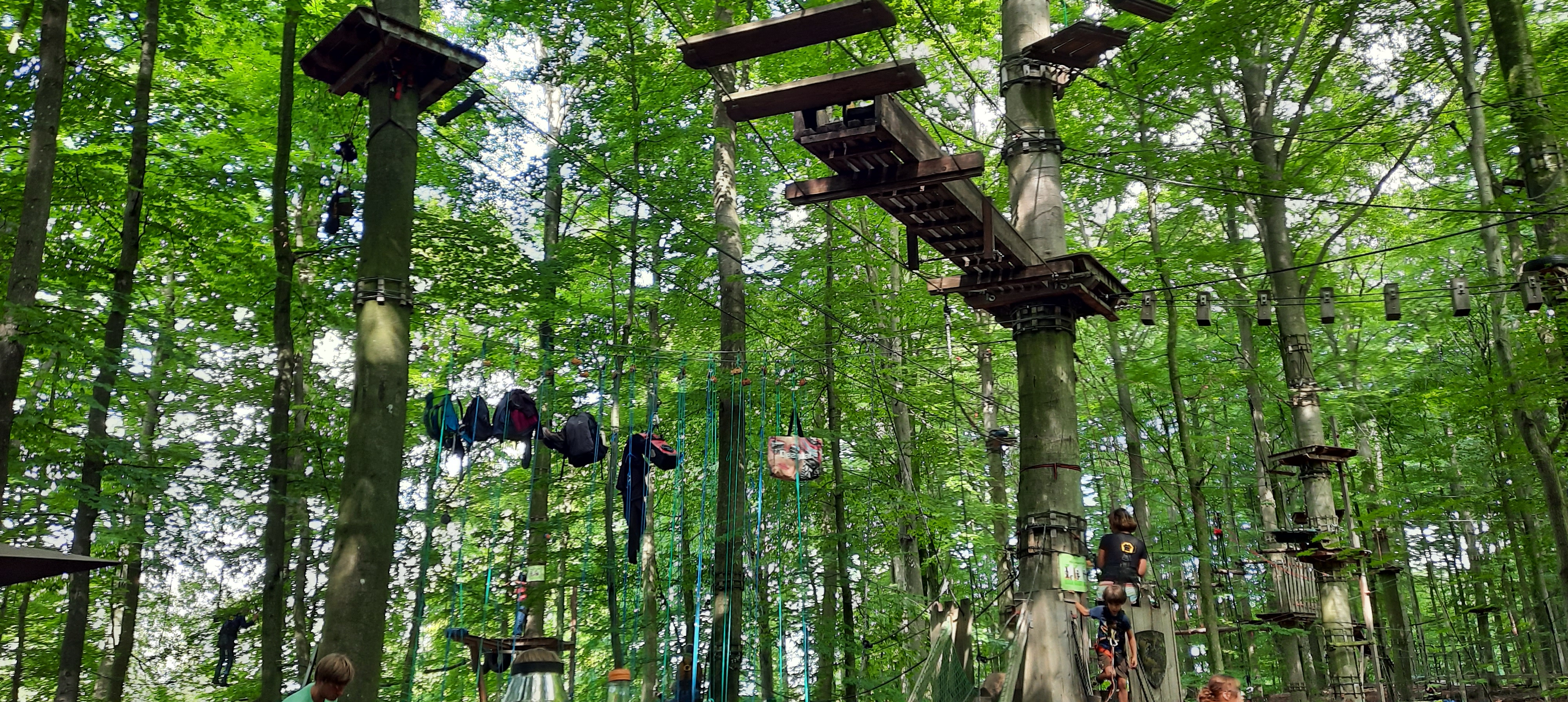 Wir sind über Balken gelaufen, haben uns wackelnden Leitern ausgesetzt, sind durch Schlaufenwege gelaufen, haben schwebende Pfosten überquert, haben uns hinabfallen lassen mit Seilrutschen, sind in Netzen gelandet und mussten dann hochklettern….mussten Schrägen überwinden…..es war wirklich lustig….wir haben mit Kindern gelacht, uns gegenseitig angefeuert und gelobt, mit jungen Erwachsenen geflachst und spaßeshalber unser eigenes Ende vorhergesagt, noch bevor dieser Tag zu Ende geht….es war einfach toll.