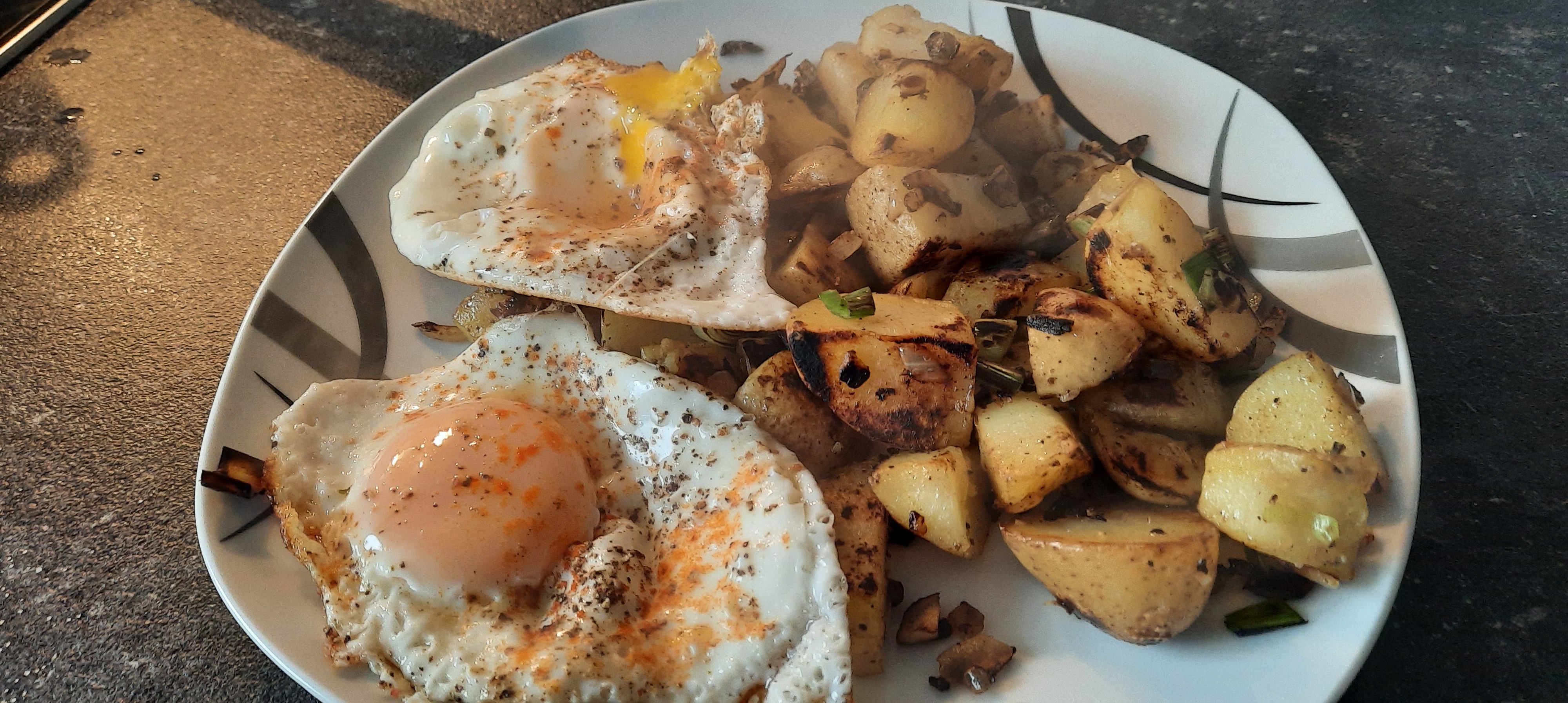 Das Schöne am Arbeiten zuhause ist, das man sich ein vernünftiges frisches Mittagessen kochen kann….Bratkartoffeln aus Pellkartoffeln mit Spiegelei…