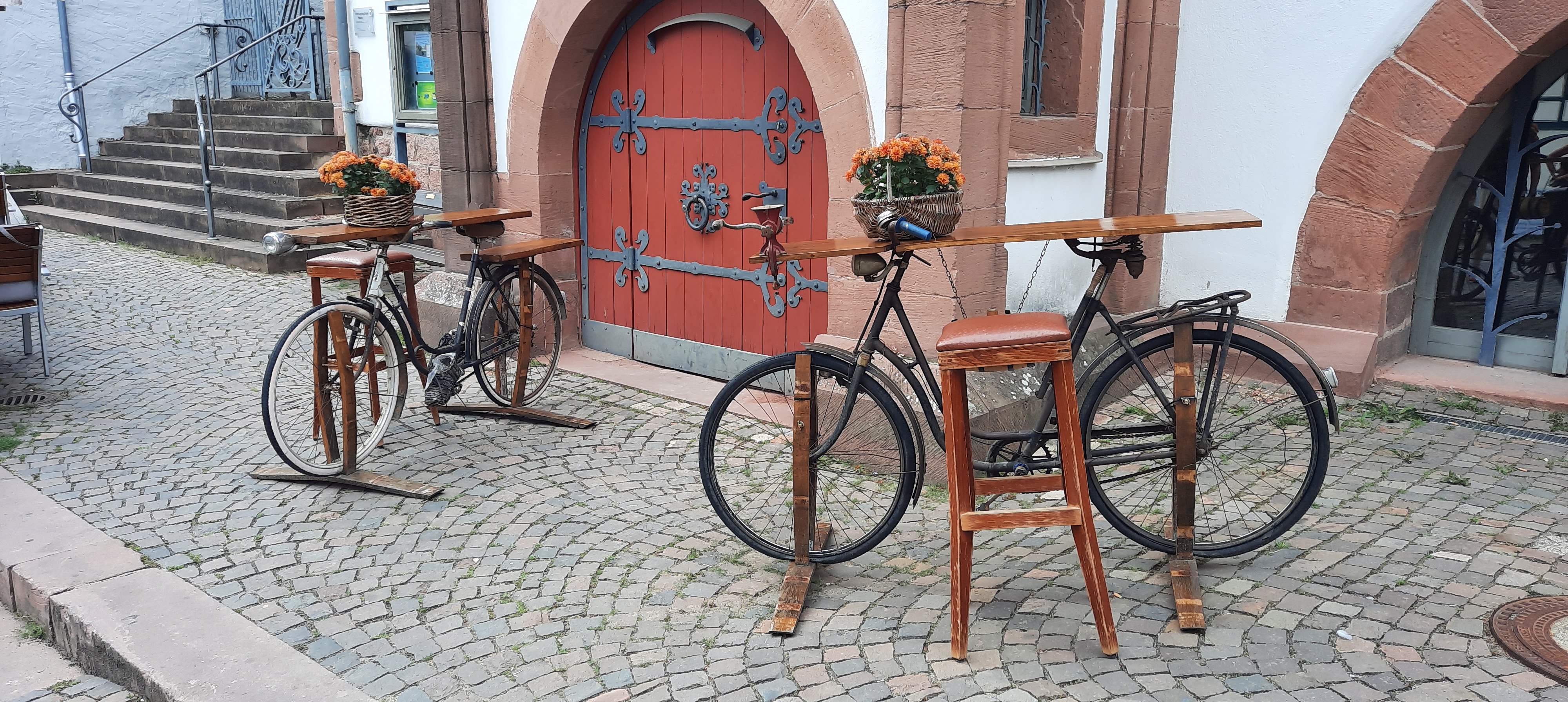 Aber zurück zu Gelnhausen…es macht einfach Spaß durch diese alte kleine Stadt zu laufen…..und überall wird liebevoll die Stadt aufgehübscht, um den altertümlichen Charakter auf moderne Art zu erhalten: Wie bei diesen 2 alten Rädern, die als Tische eines Cafés dienen