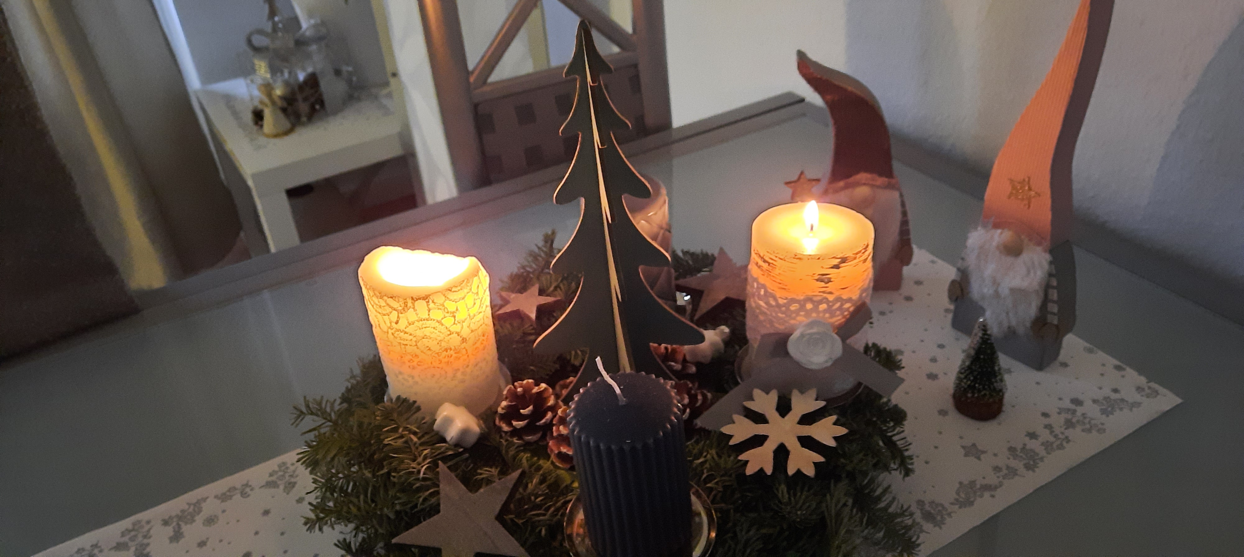 Es ist der 2. Advent und die Kerzen werfen ein schönes gedämpftes Licht in mein Wohnzimmer…während draußen ein paar wenige Schneeflocken tanzen.